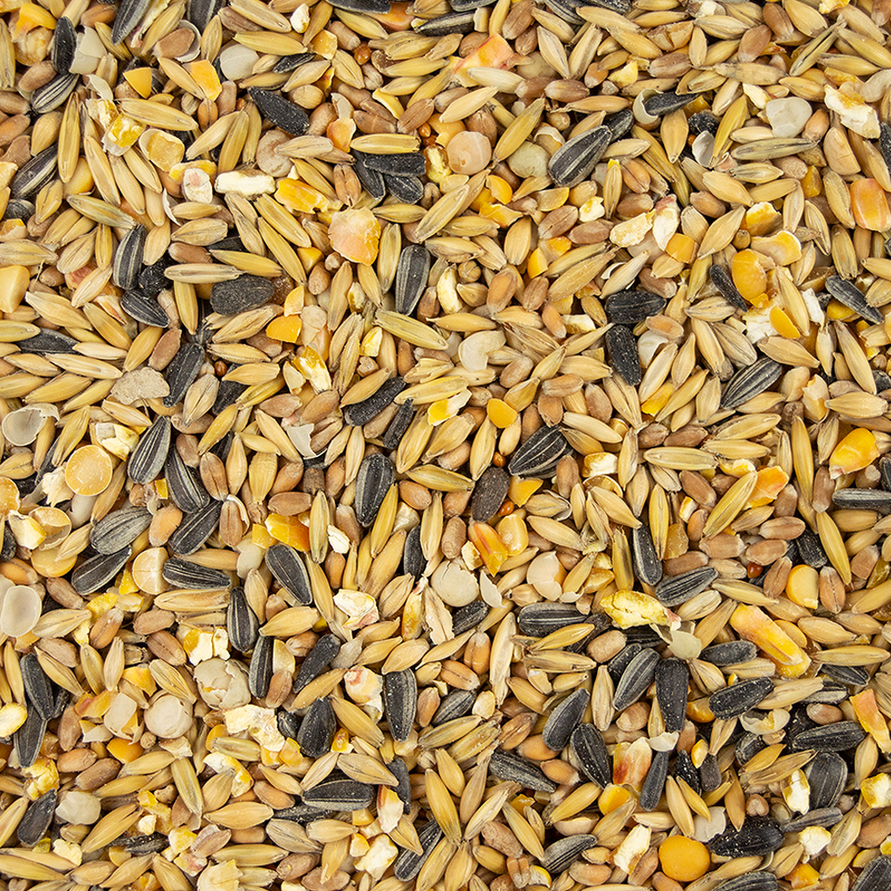 Zusammensetzung: 40,50 % Bio-Hafer, 18,90 % Bio-Mais (gewalzt), 15 % Bio-Gerste, 7,50 % Bio-Weizen, 5 % Bio-Sojabohne (getoastet, gewalzt), 5 % Bio-Erbse (gewalzt), 2,50 % kohlensaurer Muschelkalk, 2 % Bio-Sonnenblumenkerne, 1,10 % Monocalciumphosphat, 2 % Bio-Sonnenblumenöl (roh), 0,50 % Bio-Hirse, 0,61 % Calciumcarbonat, 0,35 % Natriumchlorid, 0,20 % Natriumcarbonat, 0,06 % Bio-Melasse. Die Differenz zu 100 % ist der Anteil an Mineralfutter in der Rezeptur.